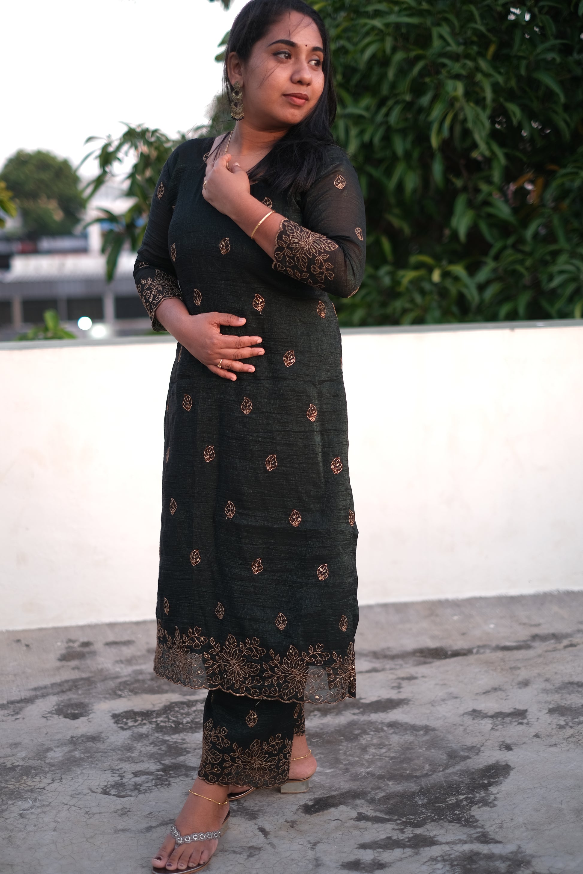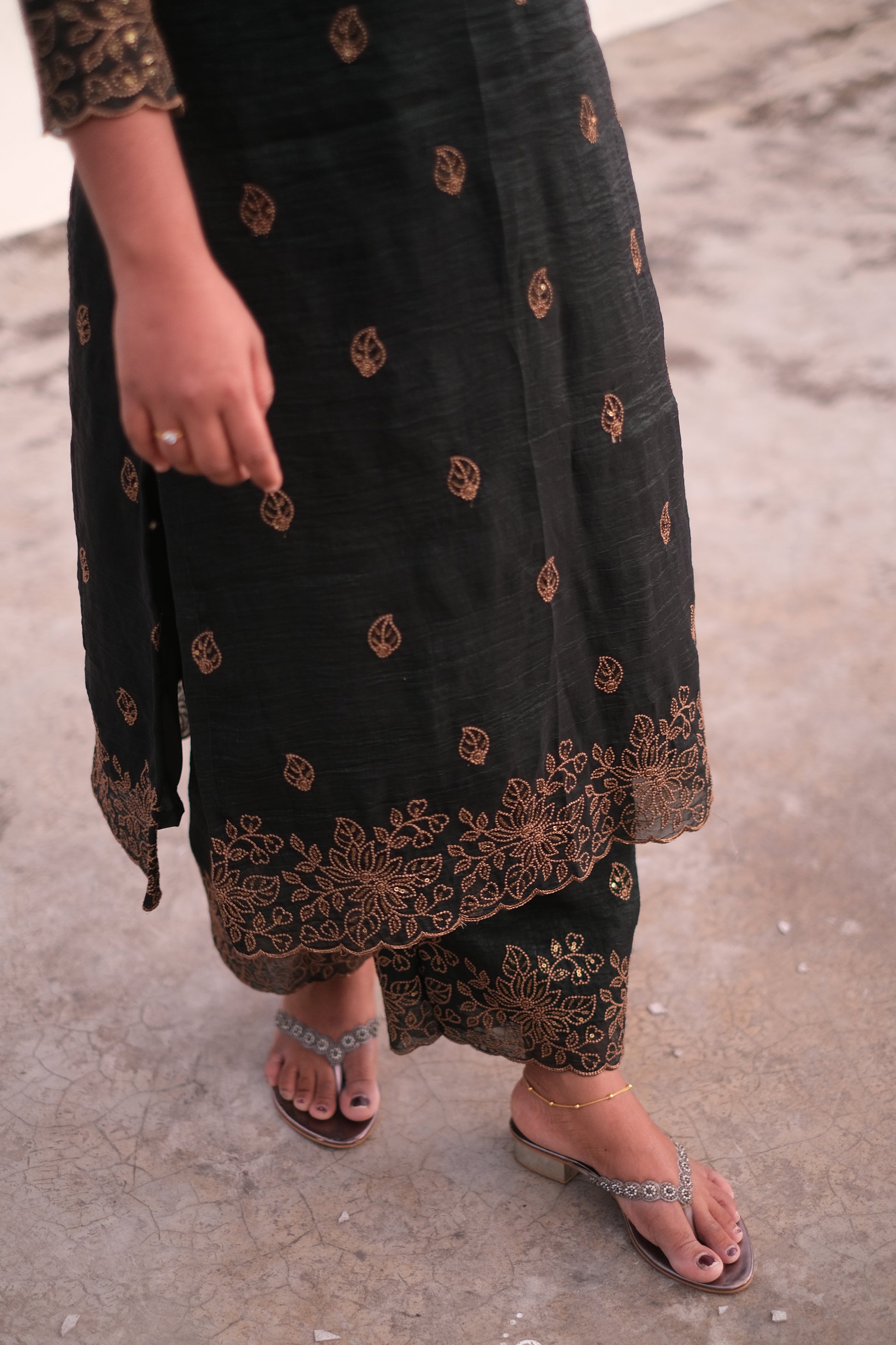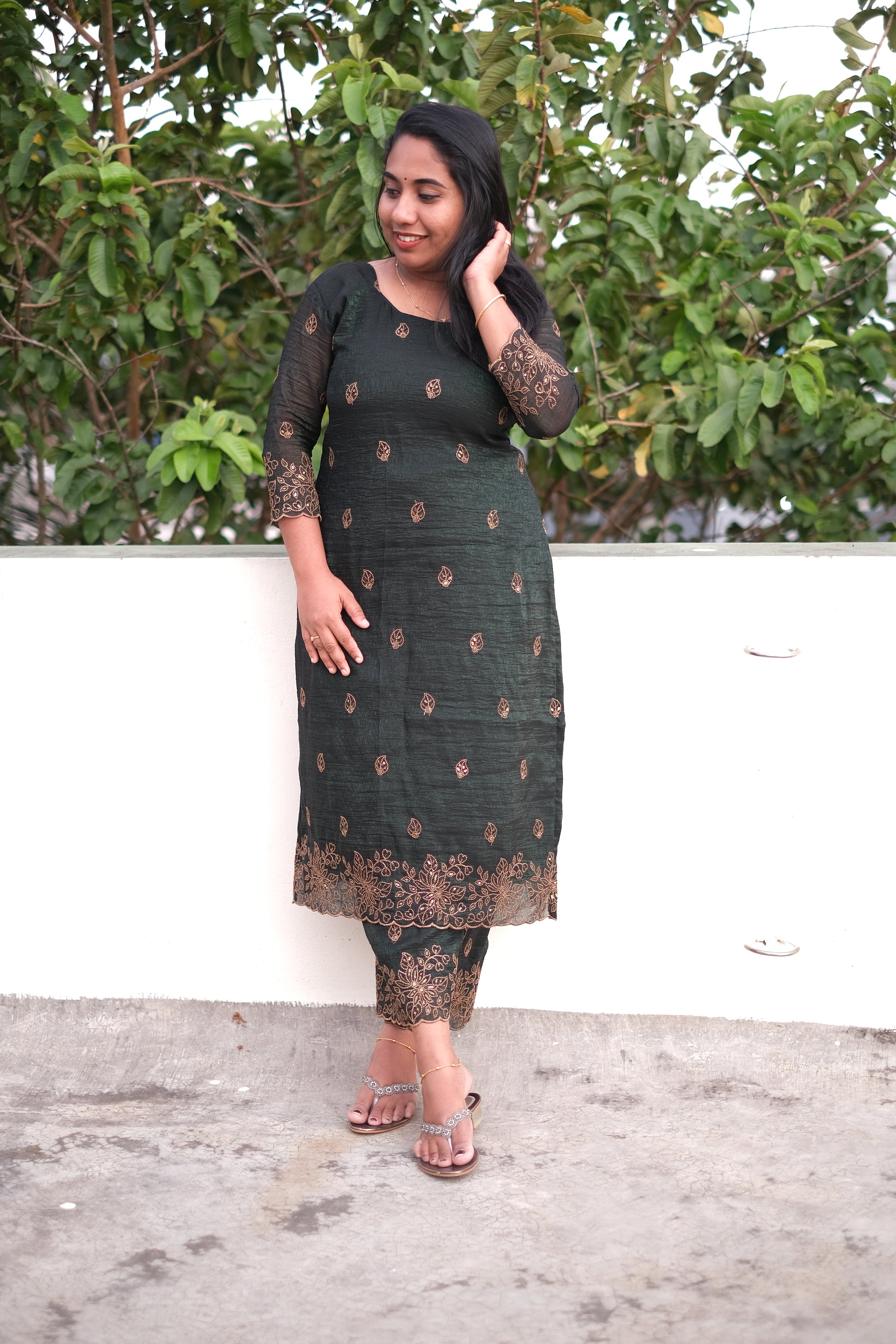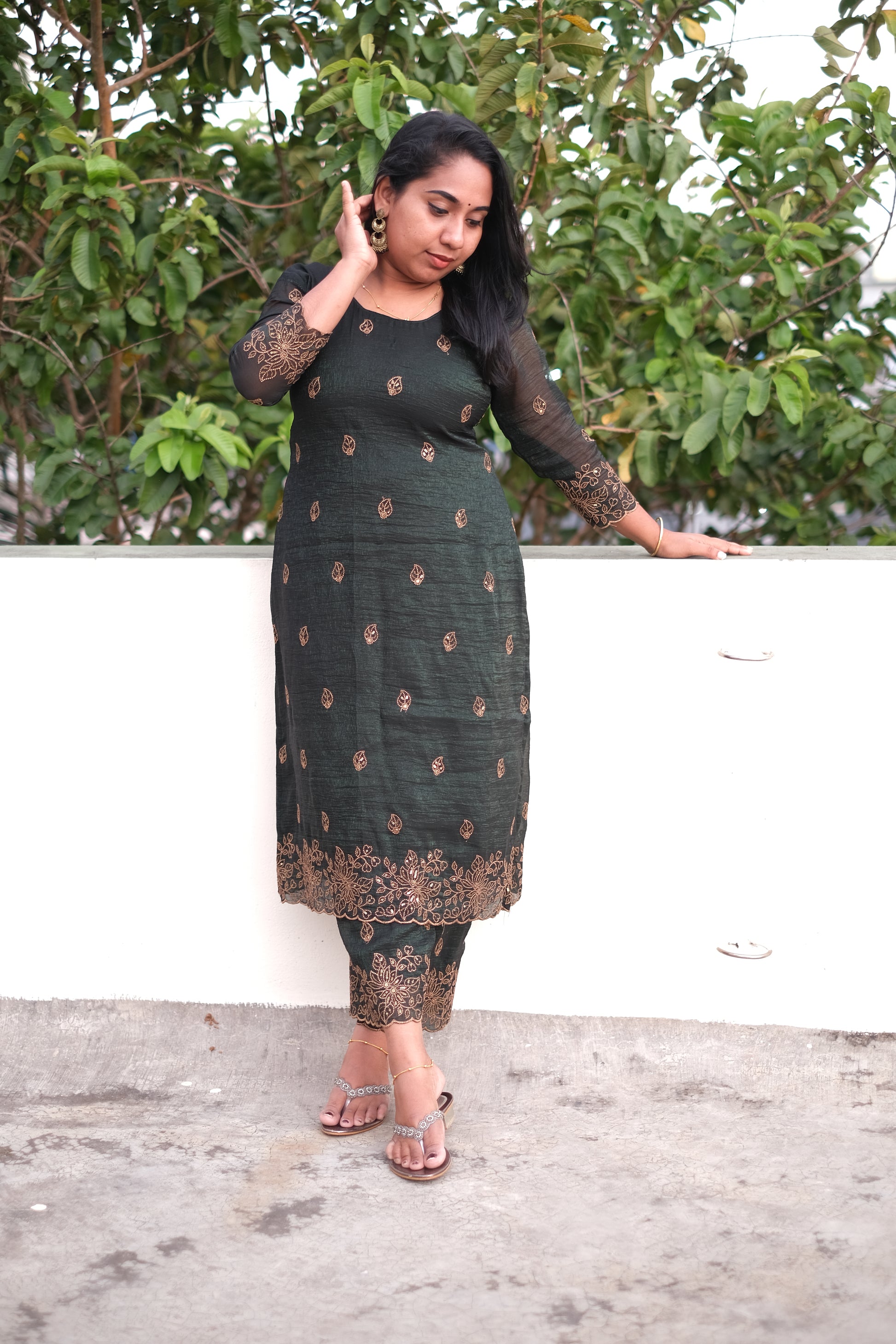 | Color | Dark Green with golden embroidered scallop with sequence work |