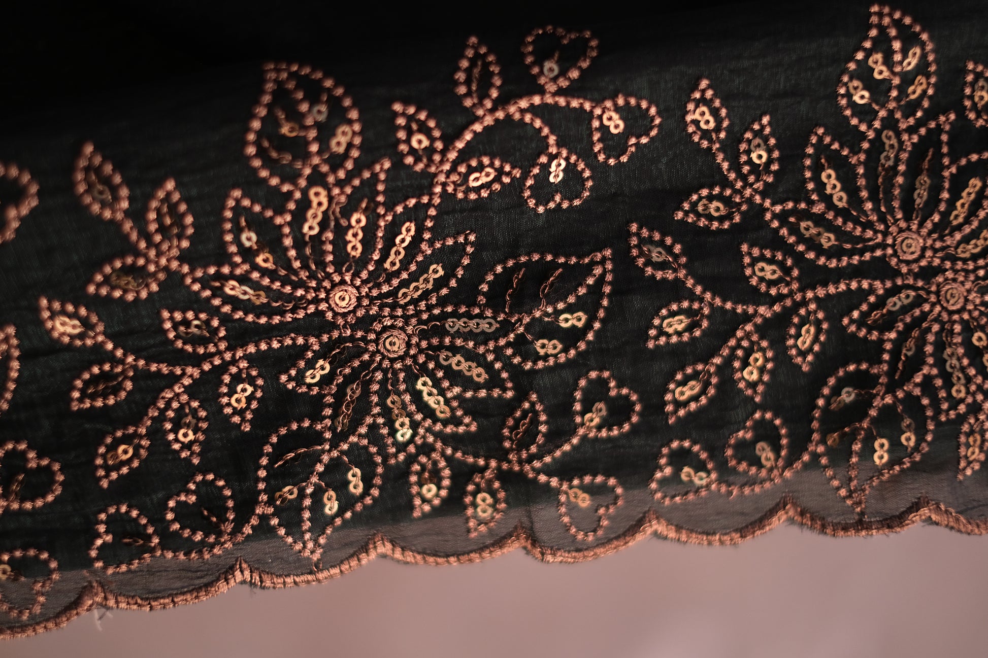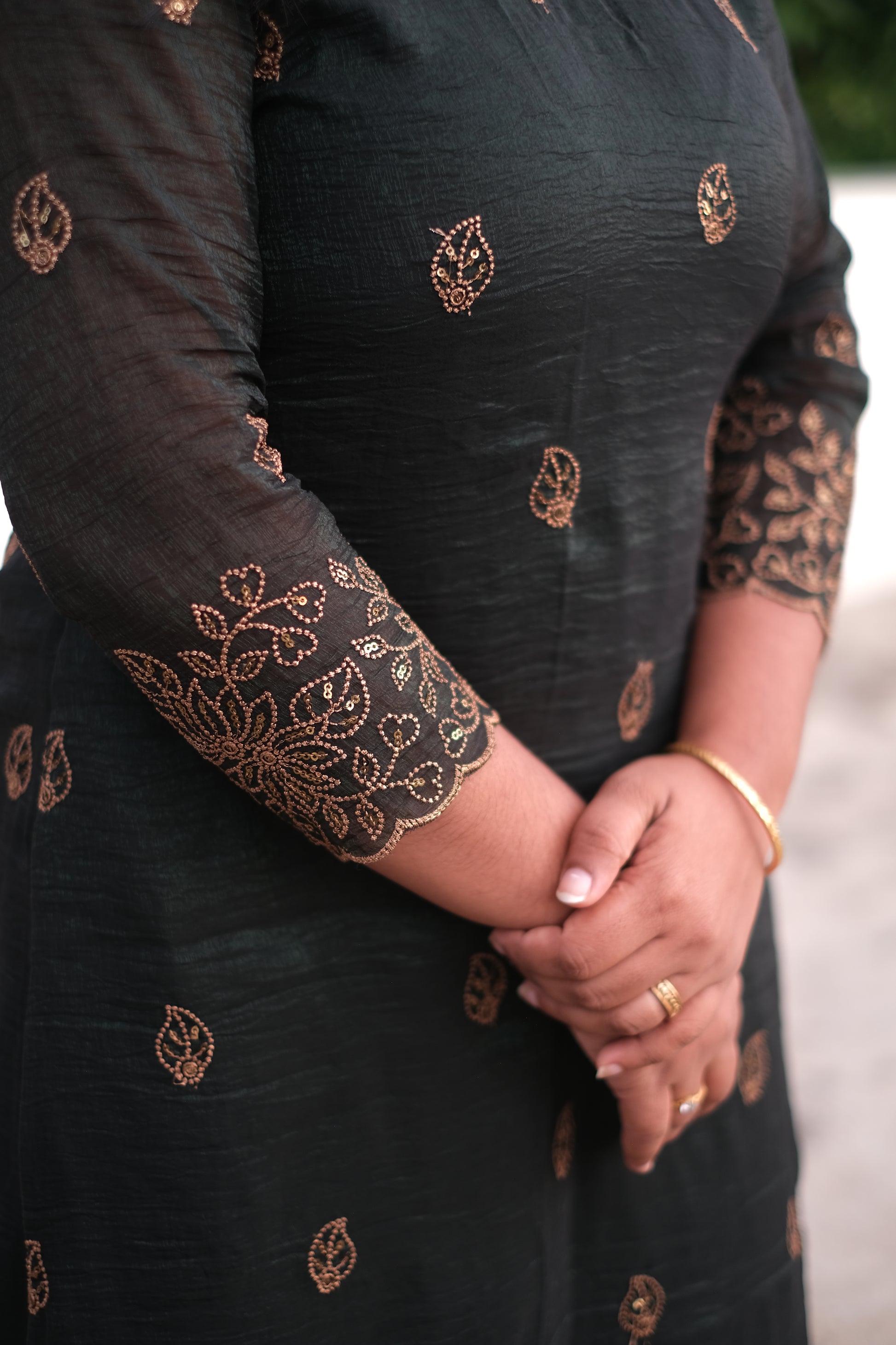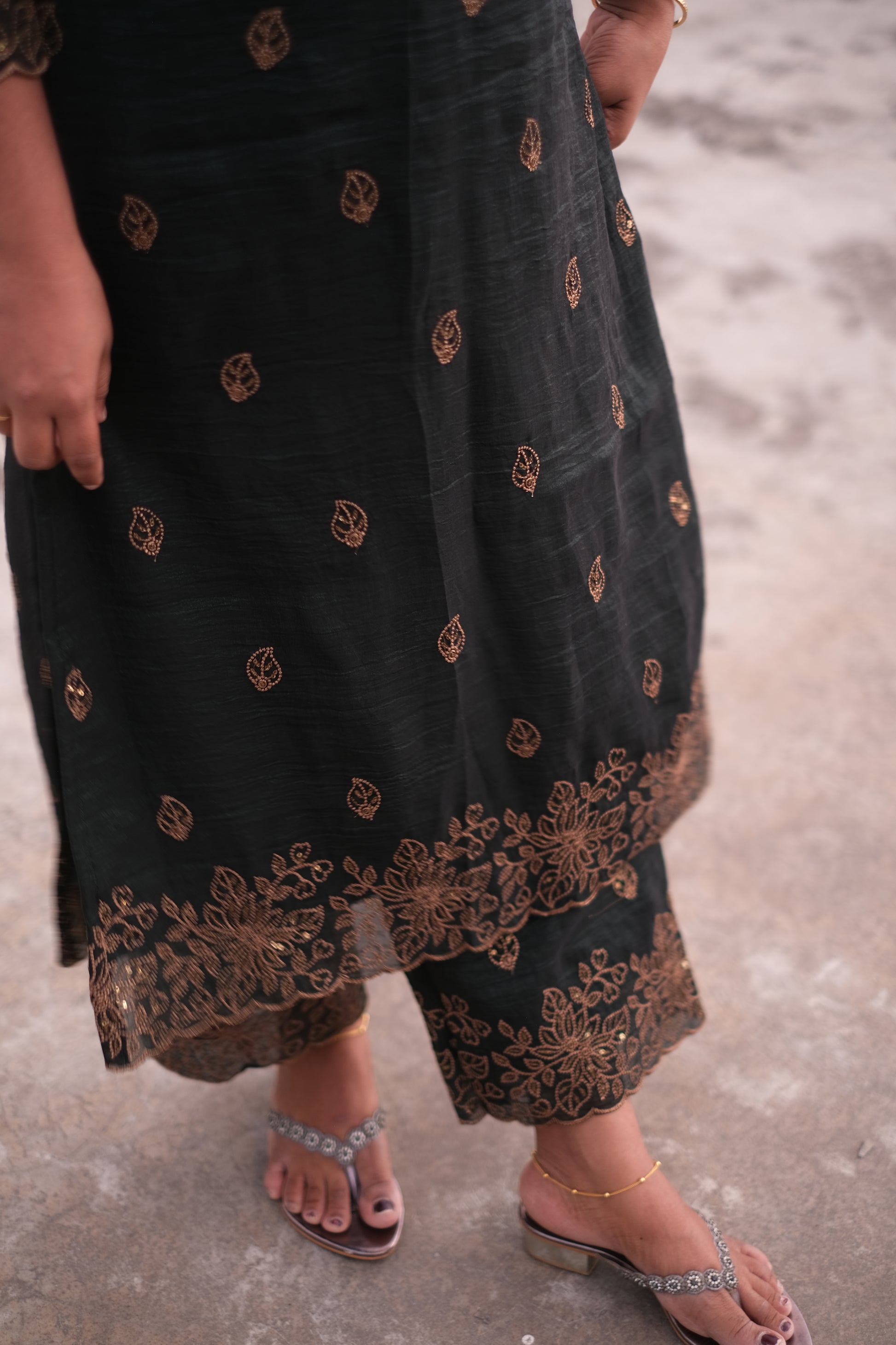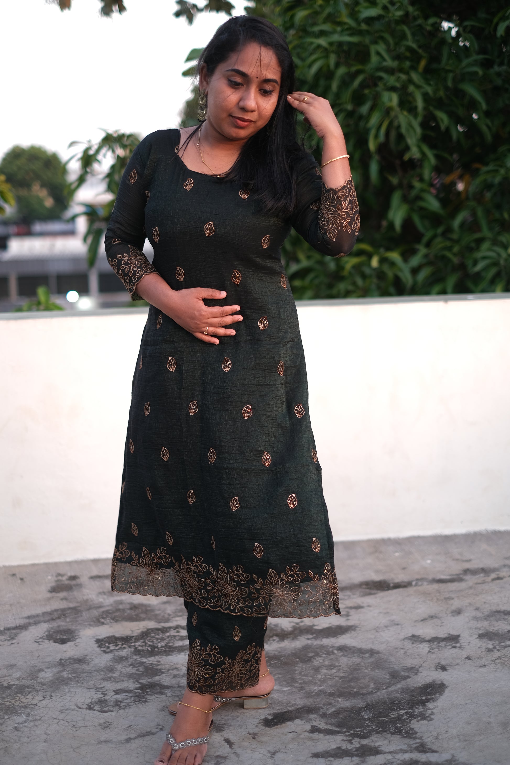 | Color | Dark Green with golden embroidered scallop with sequence work |