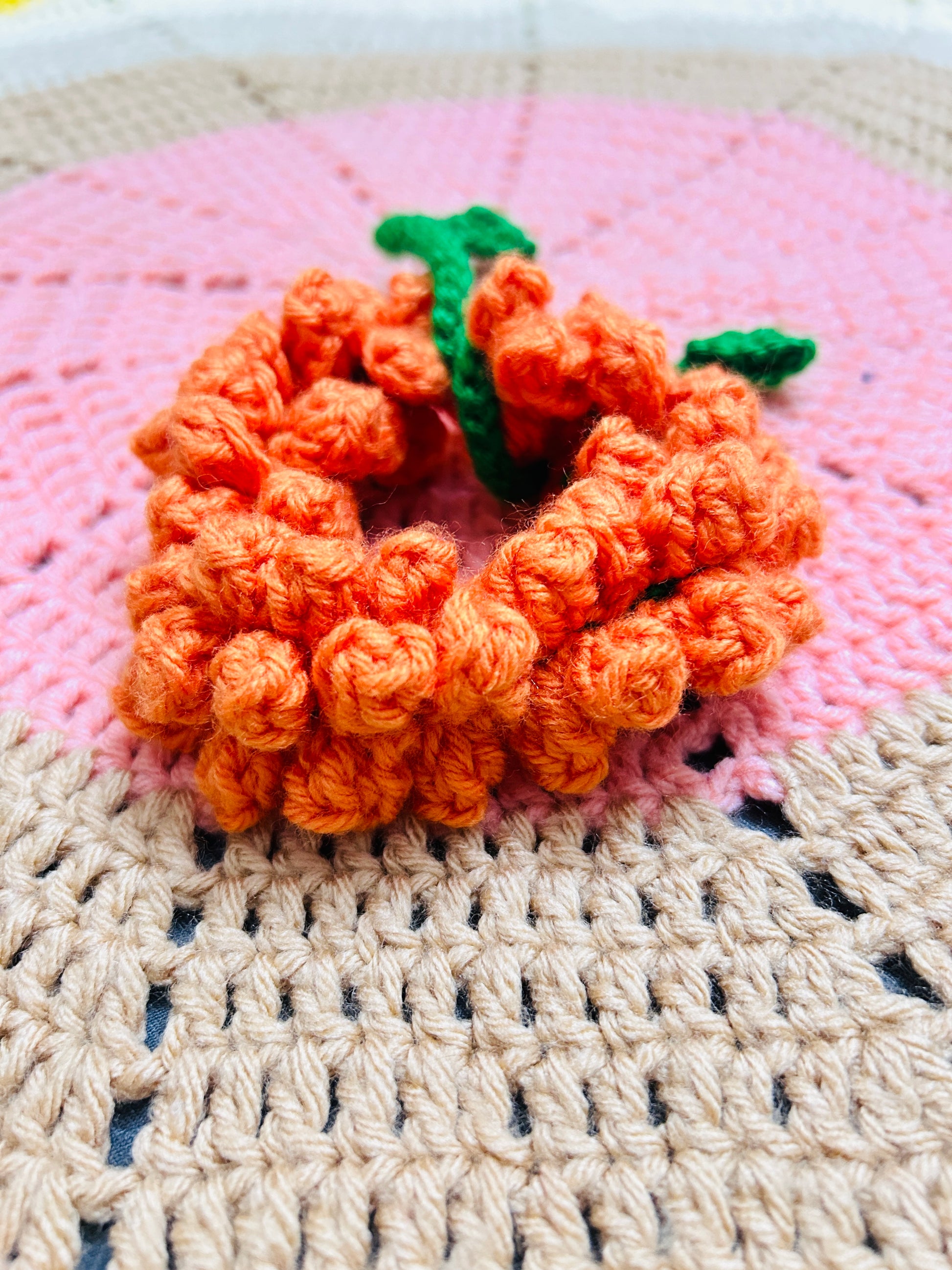 "Get ready for fall with this delightful Crocheted Pumpkin Scrunchie! Featuring a chunky, textured puff stitch design in a vibrant orange, this hair tie perfectly captures the spirit of the harvest season. The little green stem adds an extra touch of authenticity and charm. It's the perfect way to accessorize for Halloween parties, pumpkin picking, or just adding a cozy, seasonal flair to your everyday look.